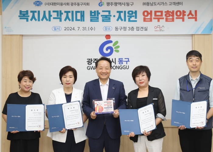 [뉴스서울] 광주 동구는 31일 복지위기가구 조기 발굴과 지역사회 안전망 강화를 위해 (사)대한미용사회 광주동구지회 및 ㈜동남도시가스 고객센터와 ‘복지사각지대 발굴·지원’을 위한 업무 협약을 체결했다고 밝혔다.