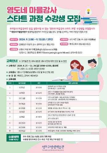 [뉴스서울] 부산시 영도구는 평생학습 지식전문성을 갖춰 마을강사를 준비하는 지역주민을 대상으로 영도네 마을강사 스타트과정 수강생을 모집한다.