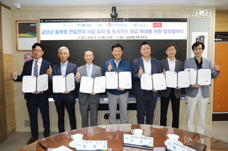 [뉴스서울] 금산군은 지난 11일 금산군청에서 JB㈜(대표이사 우재화), (사)금산군기업인협회(회장 신상오), ㈜다빈이앤씨(대표이사 박상근), ㈜케이세라셀(대표이사 임경태), ㈜리튬플러스(대표이사 전웅), 마전9리 주민(마전9리 이장 한호도)과 융복합 연료전지 사업 유치 및 도시가스 보급 확대 업무협약을 체결했다.