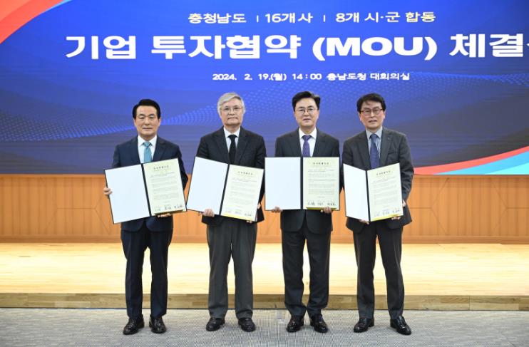 ▲ 기업투자 협약식(왼쪽 부터 백성현 시장, 해원바이오테크 전요섭 대표, 김태흠 도지사, 풍산 FNS류상우 대표) |