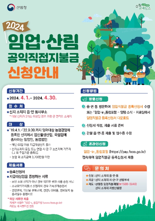 [뉴스서울] 의성군은 2024년 임업ㆍ산림 공익직접지불금 신청·접수를 4월 1일부터 4월 30일까지 진행한다고 밝혔다.