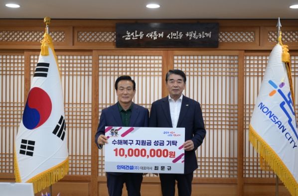 최문규 인덕건설 대표이사는 “갑작스러운 폭우로 인해 많은 피해를 입은 논산시민들에게 조금이나마 보탬이 되고자 성금을 마련했다”며, “빠른 시일 내에 피해가 복구되고 일상으로 돌아갈 수 있기를 진심으로 기원한다”고 전했다.