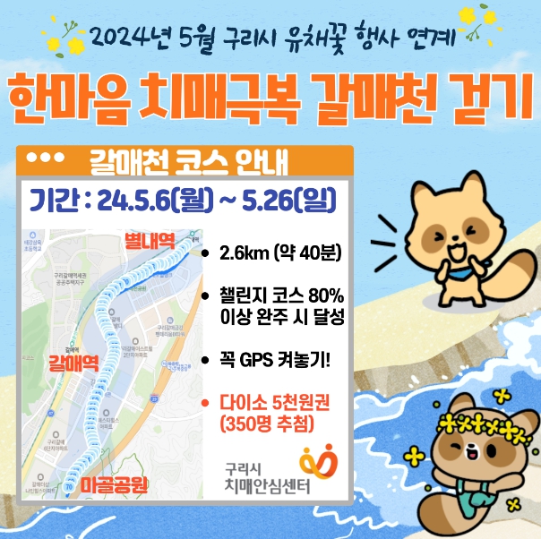 [뉴스서울] 구리시는 오는 5월 6일부터 5월 26일까지 구리 유채꽃 축제와 연계한‘한마음 치매극복 걷기 행사’에 참여하기 어려운 주민을 대상으로‘한마음 치매극복 갈매천 걷기’ 비대면 행사를 운영한다.