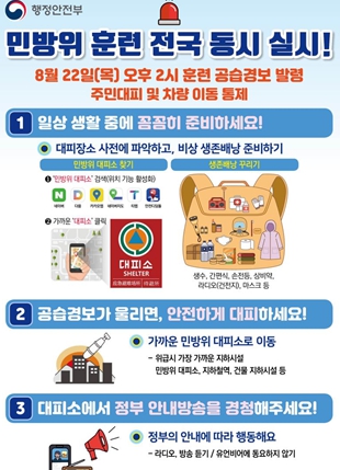 [뉴스서울] 전북특별자치도는 22일 오후 2시부터 20분간 전국에서 공습 대비 민방위훈련을 실시한다고 밝혔다.