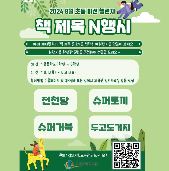[뉴스서울] 김제시립도서관은 2024년 8월 초등 미션 챌린지 프로그램으로‘책 제목 N행시’를 진행한다고 말했다.