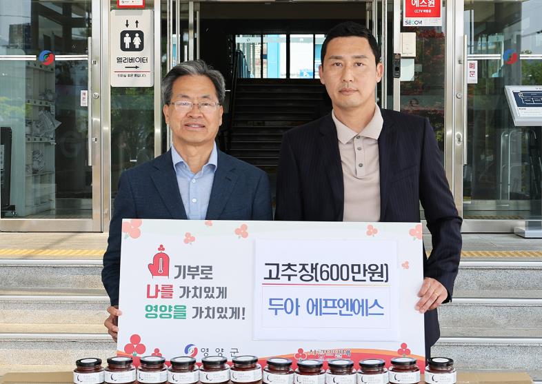 [뉴스서울] 농업회사법인 두아 에프엔에스는 11일 영양군에 영양고추로 가공한 고추장(600만 원 상당)을 기부했다.