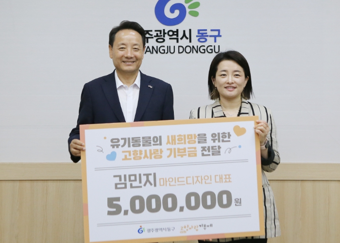 [뉴스서울] 광주 동구는 최근 고향사랑 기금사업 일환으로 신규 추진에 나선 유기동물 구조·보호 사업에 도움을 주고자 김민지 마인드디자인 대표가 5백만 원을 기부했다고 밝혔다.