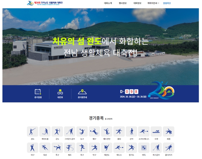 홈페이지는 ▲대회 소개(개요, 경기장 안내 등) ▲행사 정보(개회식, 폐회식 등) ▲대회 정보(경기 종목, 일정 등) ▲개최지 안내(완도 관광 해양치유 등) ▲알림 마당(공지사항, 이벤트) 등 5개 메뉴로 구성됐다.