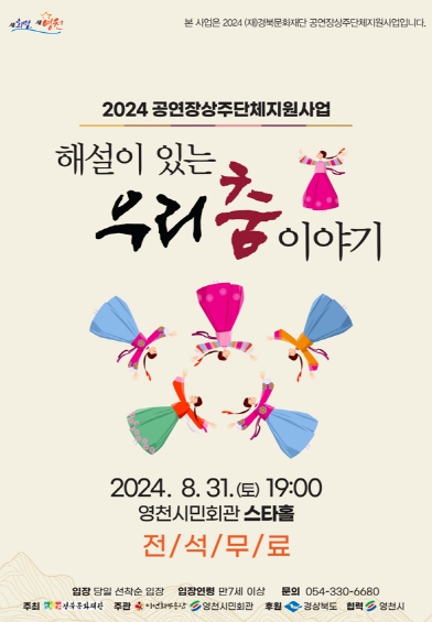 [뉴스서울] 경북문화재단이 주최하고 이언화무용단과 영천시민회관이 공동 주관하는 2024년 경북문화재단 공연장상주단체지원사업 공연 2회 중 첫 번째, 특화공연 ‘해설이 있는 우리 춤 이야기’가 오는 31일 오후 7시 영천시민회관에서 열릴 예정이다. 이번 공연은 경상북도의 후원과 영천시의 협력으로 진행된다. 입장료는 무료, 선착순 입장이며 만 7세 이상 관람이 가능하다.