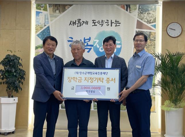 박찬일 농가는 “지역 학생들을 위해 장학금을 기탁할 수 있게 돼 기쁘다”며 “장수의 빛나는 인재들이 꿈과 희망을 실현하는 데 조금이나마 도움이 되길 바란다”고 말했다.