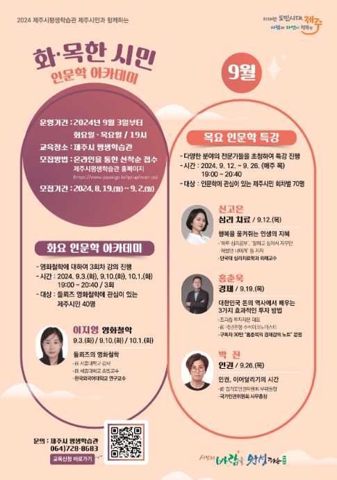 오는 9월 제주시 평생학습관에서 열리는‘화목한 시민인문학 아카데미’는 철학, 경제, 인권 등 다양한 분야의 전문가를 초청해 화요일과 목요일마다 진행된다.