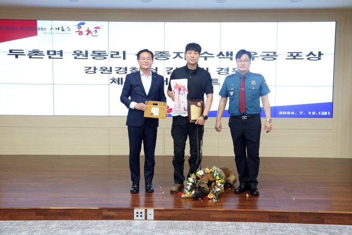 [뉴스서울] 홍천군은 7월 12일홍천군청 대회의실에서 두촌면 원동리 실종자 수색과 발견에 공을 세운 홍천경찰서(강원경찰청) 김한진 경위에게 홍천군수 표창을 수여했다.