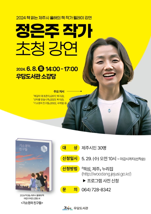 [뉴스서울] 제주시 우당도서관은 2024년 책 읽는 제주시 올해의 책 어린이 부문에 선정된 도서인 '기소영의 친구들'을 집필한 정은주 작가를 초청해 강연을 개최한다.