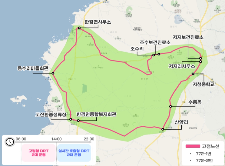 오전은 기존 노선대로 운행하며, 오후 2시 이후에는 실시간 호출(한경, 기존 772) 또는 예약제(한림, 기존 783)로 노선버스를 대체해 운행한다.