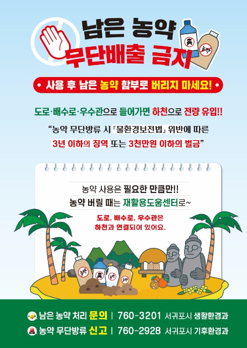 [뉴스서울] 서귀포시는 밭작물 등에 농약 살포 후 남은 잔량을 무심코 버려지는 행위로 인한 하천이나 공공수역의 오염을 예방하기 위해 읍·면·동 및 농약판매소 등에 “책받침형 홍보물 1,000여장을 오는 5월 13일부터 배부”한다.