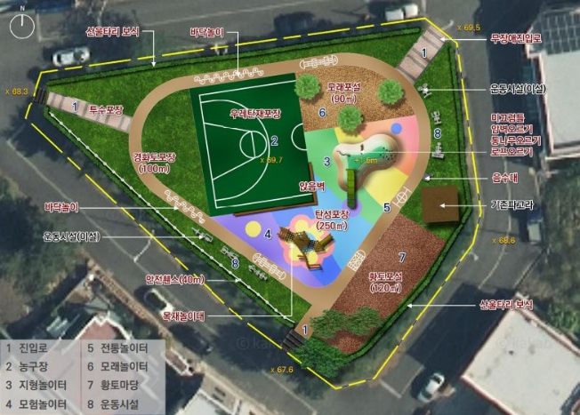 서귀포시에 따르면 놀이터 조성 구상 단계부터 지역을 대표하는 인근 어린이집 관계자 및 마을대표와 수차례의 논의를 거쳐 다양한 연령층이 함께하고 즐길 수 있도록 공간 구성에 공을 들였다.