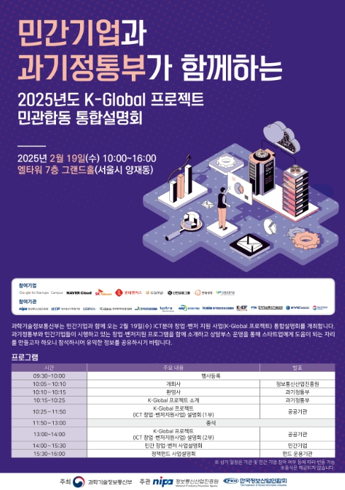 [뉴스서울] 과학기술정보통신부는 '한국형 국제 사업(K-글로벌 프로젝트)'의 2025년 대상 사업들을 소개하는 통합안내문을 공고하고, 사업에 참여하는 민간·공공의 지원 사업들을 소개하는 민·관 합동 통합설명회를 2월 19일, 서울 양재동 엘타워에서 개최했다고 밝혔다.