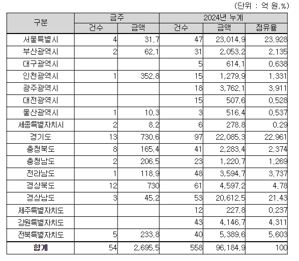 지역별로는 경기도 731억 원, 경상북도 730억 원, 인천광역시 353억 원, 그 밖의 지역이 882억 원이다.