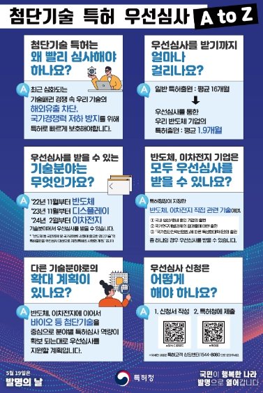 특허청은 5월19일 발명의 날을 맞아 반도체심사추진단(이하 추진단) 1년 운영 성과, 첨단기술 지원 정책 등을 담은 ‘첨단기술 특허 우선심사 에이 투 지(A to Z)’를 공개했다고 밝혔다.