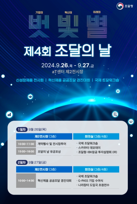 조달청은 9월 26일부터 27일까지 이틀간 aT센터(서울 양재동, 제2전시장)에서 ‘기업의 벗, 혁신의 빛, 미래의 별’을 주제로 '제4회 조달의 날' 행사를 개최한다.