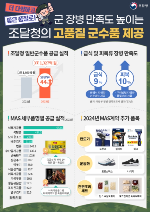 ▲ 군 장병 만족도 높이는 조달청의 고품질 군수품 제공 인포그래픽 |