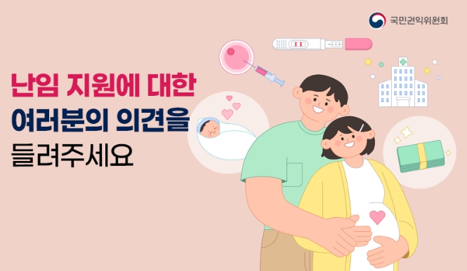 이에 국민권익위는 난임 시술 지원금 신청 절차 간소화가 필요한지, 가임력검사(산전검사)을 받을 의향이 있는지 등에 대한 국민의 의견을 듣는다.
