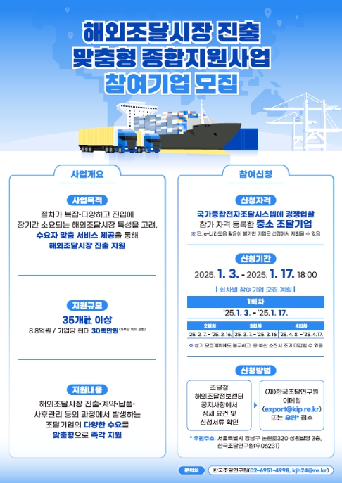 지원사업은 오는 17일까지 1회차 기업 모집 후 2월부터 본격 지원하며, 자세한 사항은 조달청 해외조달정보센터를 통해 확인할 수 있다.