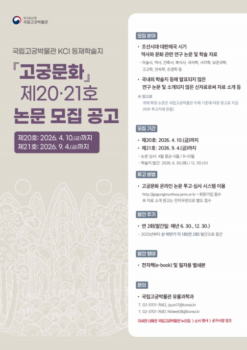 [뉴스서울] 국가유산청 국립고궁박물관은 조선시대와 대한제국기의 역사·문화 연구를 활성화하기 위해 박물관에서 매년 발간하는 학술지 『고궁문화』 제20호와 제21호에 수록할 논문을 모집한다. 제20호는 올해 6월 30일, 제21호는 12월 30일 발간 예정이며, 논문 접수 마감일은 각각 4월 10일과 9월 4일이다.