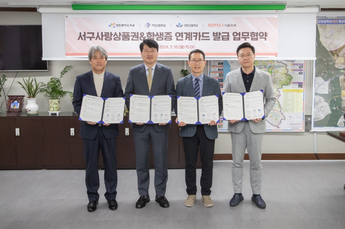 [뉴스서울] 인천 서구는 18일 가정고등학교, 대인고등학교, ㈜코나아이와 ‘서구사랑상품권(서로e음)과 학생증이 결합된 특화카드 발급’을 위한 업무협약을 체결했다고 밝혔다.