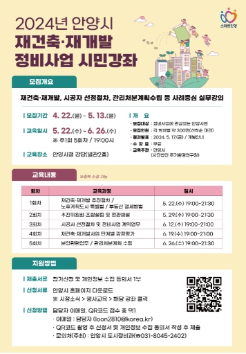 강좌는 안양시청 강당에서 오는 5월 22일부터 6월 26일까지 매주 수요일 저녁 7시부터 9시 30분까지 총 5회차로 진행된다. 정비사업에 관심 있는 안양시민이면 누구나 신청해 무료로 수강할 수 있다.