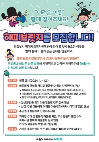 [뉴스서울] 의정부시는 4월 15일부터 6월 7일까지 해피브릿지(의정부시 명예사회복지공무원) 집중 모집 기간을 운영한다.