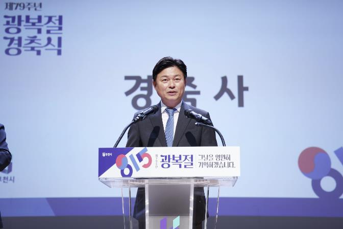 ▲ 조용익 부천시장이 제79주년 광복절 경축사를 하고 있다. |