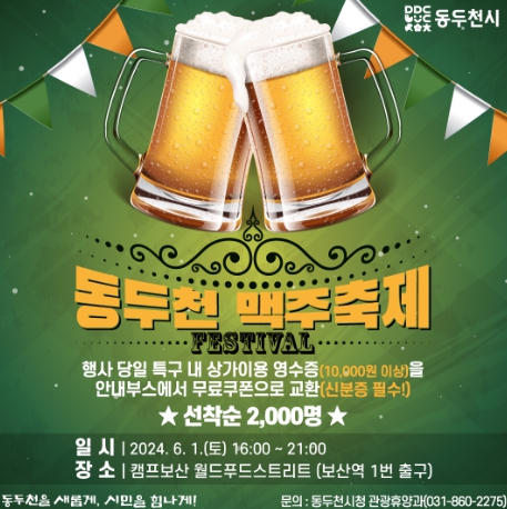 [뉴스서울] 동두천시는 오는 6월 1일 보산동 월드푸드 거리 일원에서 ‘2024 동두천 맥주 축제’를 개최한다. 이번 축제는 동두천시와 보산동 상가연합회가 협력해 지역 상권 활성화를 목적으로 이뤄진다.