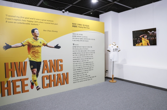 | ▲ 황희찬 선수 전시에는 그동안 입었던 유니폼과 축구화, 감동적인 경기 장면이 전시되어 있다. |