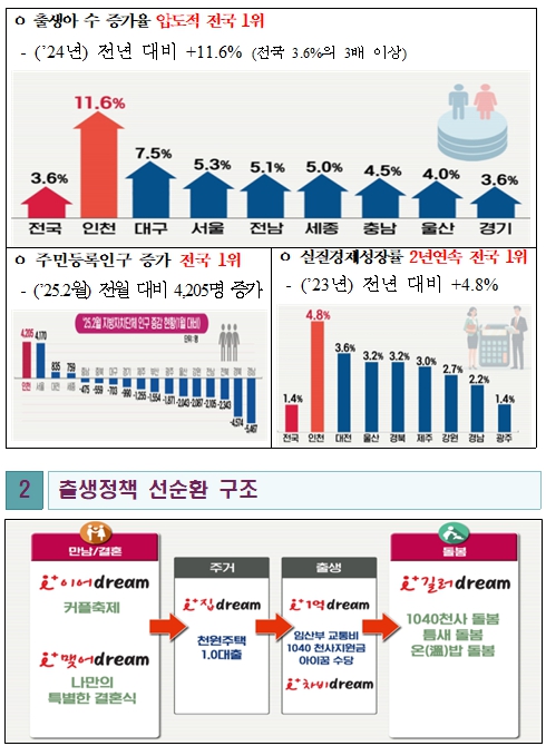 인천시는 2023년 출생정책 1호( 1억드림)를 시작으로, 2호( 집드림), 3호( 차비드림)까지 연이어 발표하며 인구 문제 해결에 적극 대응해 왔다.