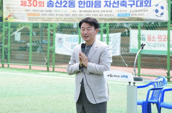 | ▲ 김동근 시장이 5월 12일 ‘제30회 송산2동 한마음 자선축구대회’에 참석해 축사를 하고 있다. |