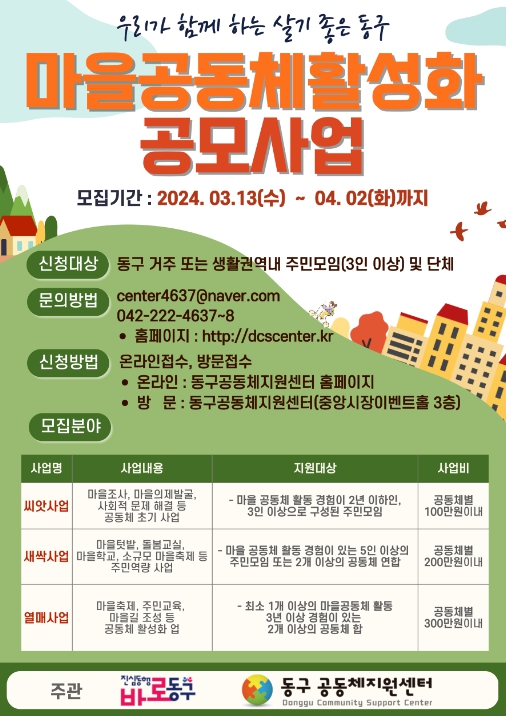 [뉴스서울] 대전 동구는 ‘2024 동구 마을공동체 활성화 사업’을 추진,분야별 공모사업 접수를 받는다고 19일 밝혔다.