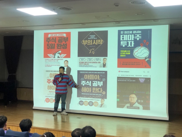 | ▲ 24일 노은도서관에서 최고민수 작가가 주식특강을 진행하고 있다. |