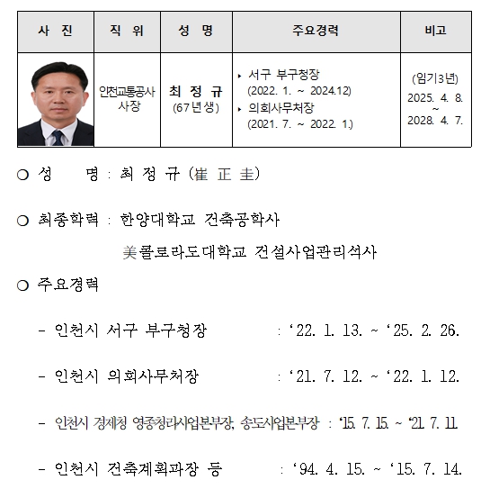 신임 최정규 사장은 1989년 기술고시에 합격한 이후, 인천시 인재개발원, 인천지하철건설본부 건축과장, 경제자유구역청 영종청라사업본부장과 송도사업본부장, 인천시 의회사무처장, 서구 부구청장 등 주요 보직을 두루 거치며 풍부한 경험을 쌓아왔다.