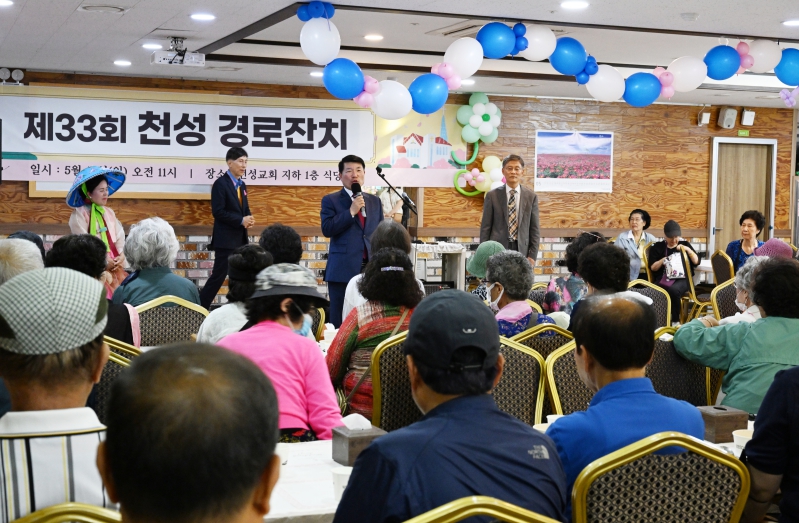 이날 행사는 5월 가정의 달을 맞아 지역 노인들이 건강하게 한 해를 보내기를 기원하며 마련된 행사다. 강석우 담임목사를 비롯한 천성교회 교인들은 새벽부터 음식을 준비하고, 거동이 불편한 노인들은 직접 차량으로 행사장까지 안내하는 등 행사를 위해 최선을 다했다.