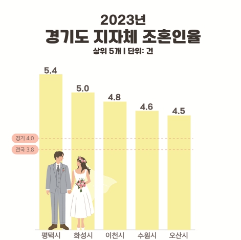 실제 평택시의 경우 지난해 조혼인율이 5.4건으로 기록됐으며, 뒤를 이어 △화성시(5.0) △이천시(4.8) △수원시(4.6) △오산시(4.5) △시흥시(4.5) △하남시(4.4) △성남시(4.1) △안양시(4.1) △안성시(4.0) △양주시(4.0) △연천군(4.0) 등이 4.0건 이상의 조혼인율을 기록했다.
