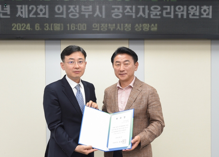 | ▲ 김동근 시장이 6월 3일 ‘2024년 제2회 공직자윤리위원회’ 회의에 앞서 오원찬 위원장을 위촉한 뒤 함께 기념사진을 찍고 있다. |