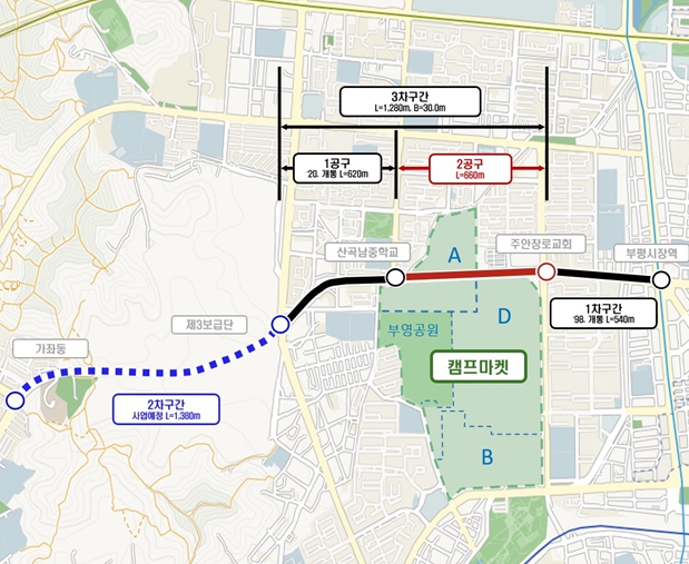 캠프마켓을 지나는 3차 구간(주안장로교회~제3보급단, 1,280m)은 미군기지 반환과 토양정화의 문제로 1공구와 2공구로 나눠 공사한다. 1공구(산곡남중학교~제3보급단)는 지난 2020년 개통됐지만, 2공구(주안장로교회~산곡남중학교)는 지난해 12월 캠프마켓 D구역 반환과 A구역 토양정화가 완료되면서 이번에 착공하게 됐다.