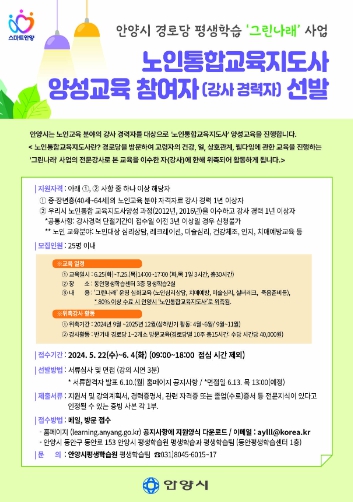[뉴스서울] 안양시는 경로당 평생학습 ‘그린나래’ 사업의 전담 강사인 ‘노인통합교육지도사’ 양성과정 참여자를 모집한다고 21일 밝혔다.