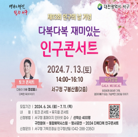 [뉴스서울] 대전 서구가 오는 13일 구청 2층 구봉산홀에서 '다복다복 재미있는 인구콘서트'를 개최한다고 3일 밝혔다.