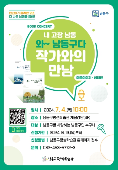 [뉴스서울] 인천시 남동구는 민선 8기 2주년을 기념해 7월 4일 오전 10시 남동구 평생학습관에서 ‘내 고장 남동 와~ 남동구다’ 저자와의 북 콘서트를 진행한다고 18일 밝혔다.