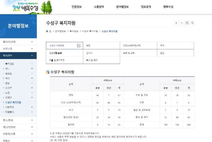 ▲ 수성구청 홈페이지에 새로 신설된 ‘수성구 복지자원’ 메뉴 |