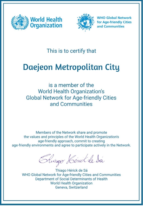 [뉴스서울] 대전시는 세계보건기구(WHO)로부터 고령친화도시 국제네트워크(Global Network of Age-Friendly Cities & Communities, GNAFCC) 가입을 인증받았다.