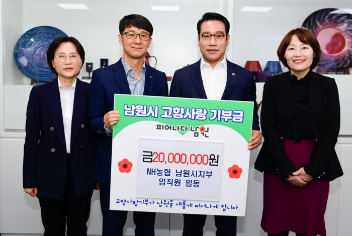 최경식 남원시장은 “남원시지부와 남원시가 함께 피어날 수 있도록 고향사랑기부제 정착과 건전한 기부문화 조성을 위해 힘써주신 남원시지부 임직원 여러분께 진심으로 감사드린다”고 인사를 전했다.