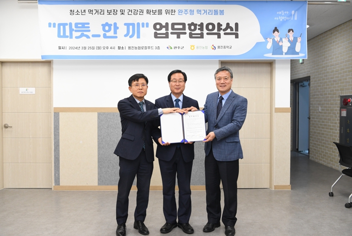 지난 25일 완주군과 용진중, 용진농협은 ‘중학생 아침결식 개선 시범사업’과 연계한 ‘완주형 먹거리돌봄 따뜻_한 끼’ 업무협약을 체결했다.